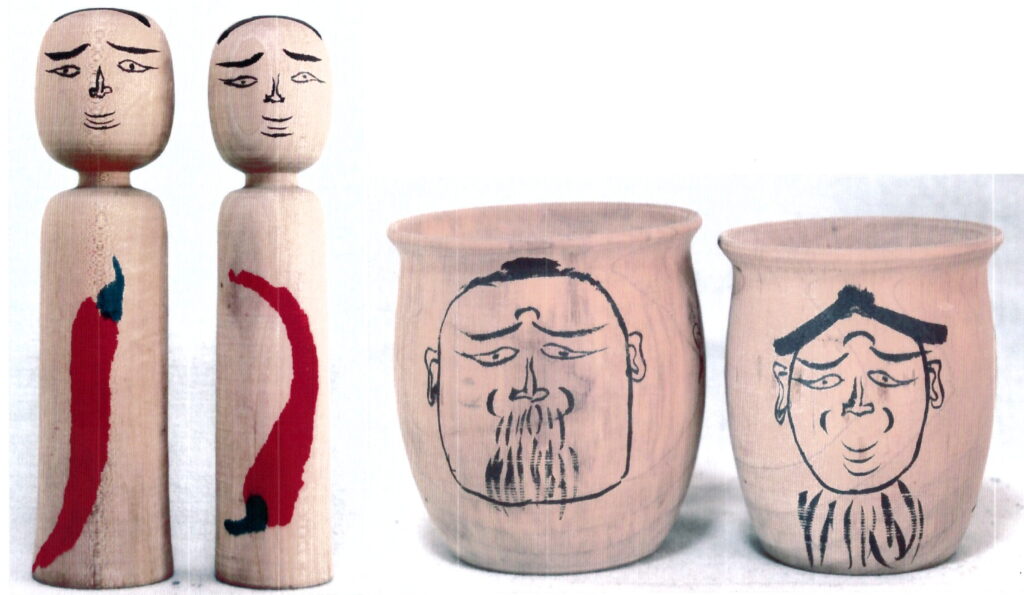 左端には、人面墨書土器から発想された小寸こけし2本があります。人面墨書土器は奈良時代の出羽の柵秋田城趾発掘で出土した土器である。土器には人面が描かれていた。今さんの来訪の折、秋田城趾を訪ねた。土器を見て「凄い、凄い!」と筆の技を賞賛され、しばらく見惚れていた。数ヶ月後、「できたヨ。」と、壺風(「N015」)に仕上げて来られた。「天平の名人も顔負けだネ.」と言ったら、笑って「イヤイヤ、太刀打ちできる技ではない!」と、「天平の思いの品」である。