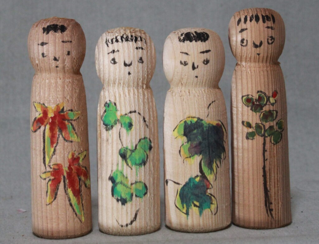 「木おぼこの会」第30回頒布こけしです。左から本人型(13cm)「モミジの葉」「アケビの葉」「桑の葉」「バラの葉」模様です。木地は秋田杉か?ザックリと挽かれ、バンカキや紙やすりは使わず、挽かれた木肌に色を置かれています。手紙には、「頒布が遅れてしまいました」「初冬の葉っぱです。色は顔料を使ってみました。いかがですか、みて下さい」とありました。